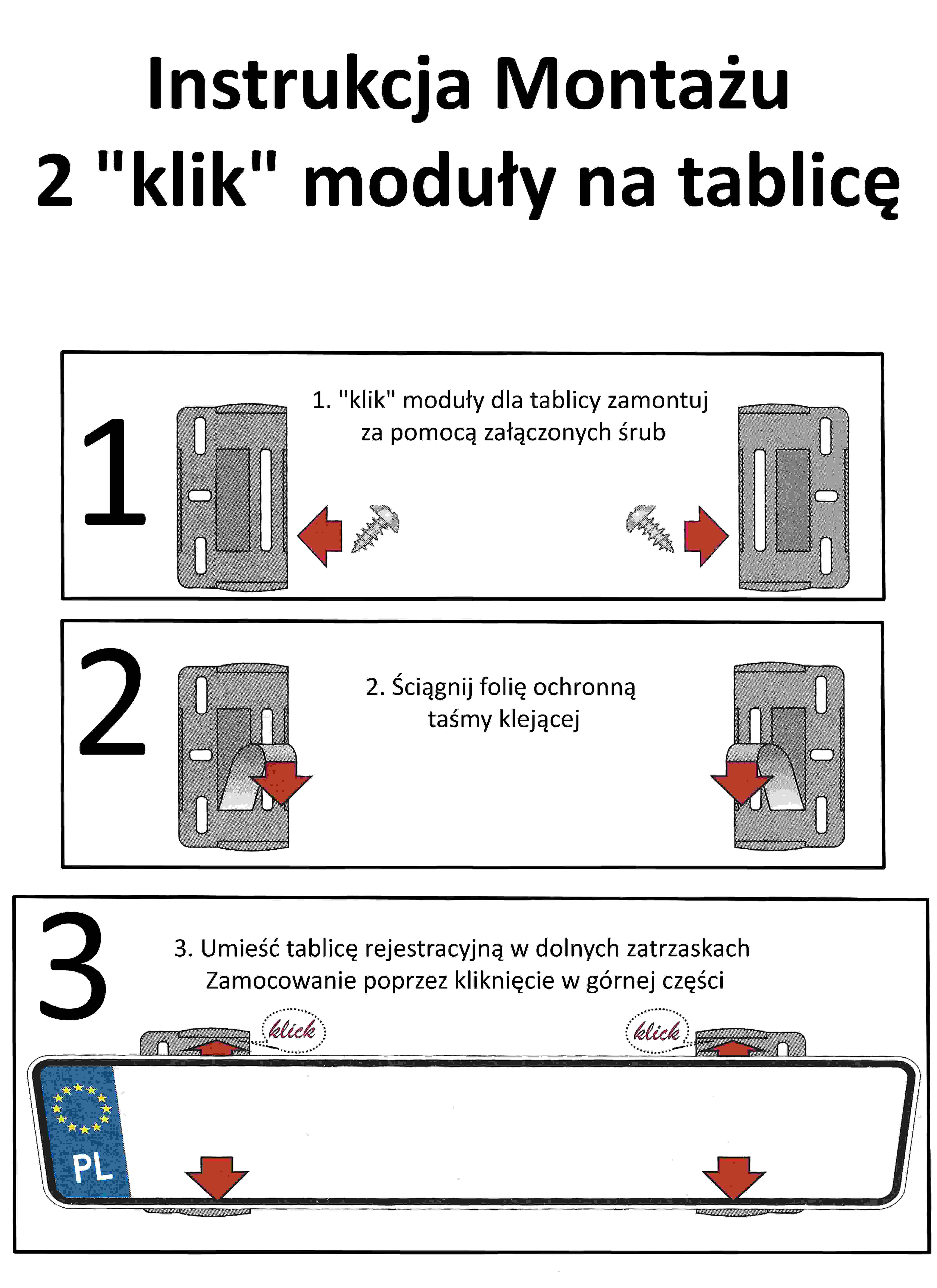 Cena dotyczy 4 szt. modułów "KLIK", służących do montażu dwóch tablic rejestracyjnych.